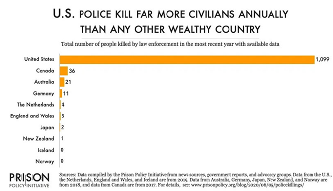 In 2015, liberal media outlets began counting for themselves and returned tallies that ranged from 990 to 1,357 for that year. Regardless of the variation, the issue is blatant compared to other developed countries around the world. The next closest developed nation is Canada with 36 deaths3.